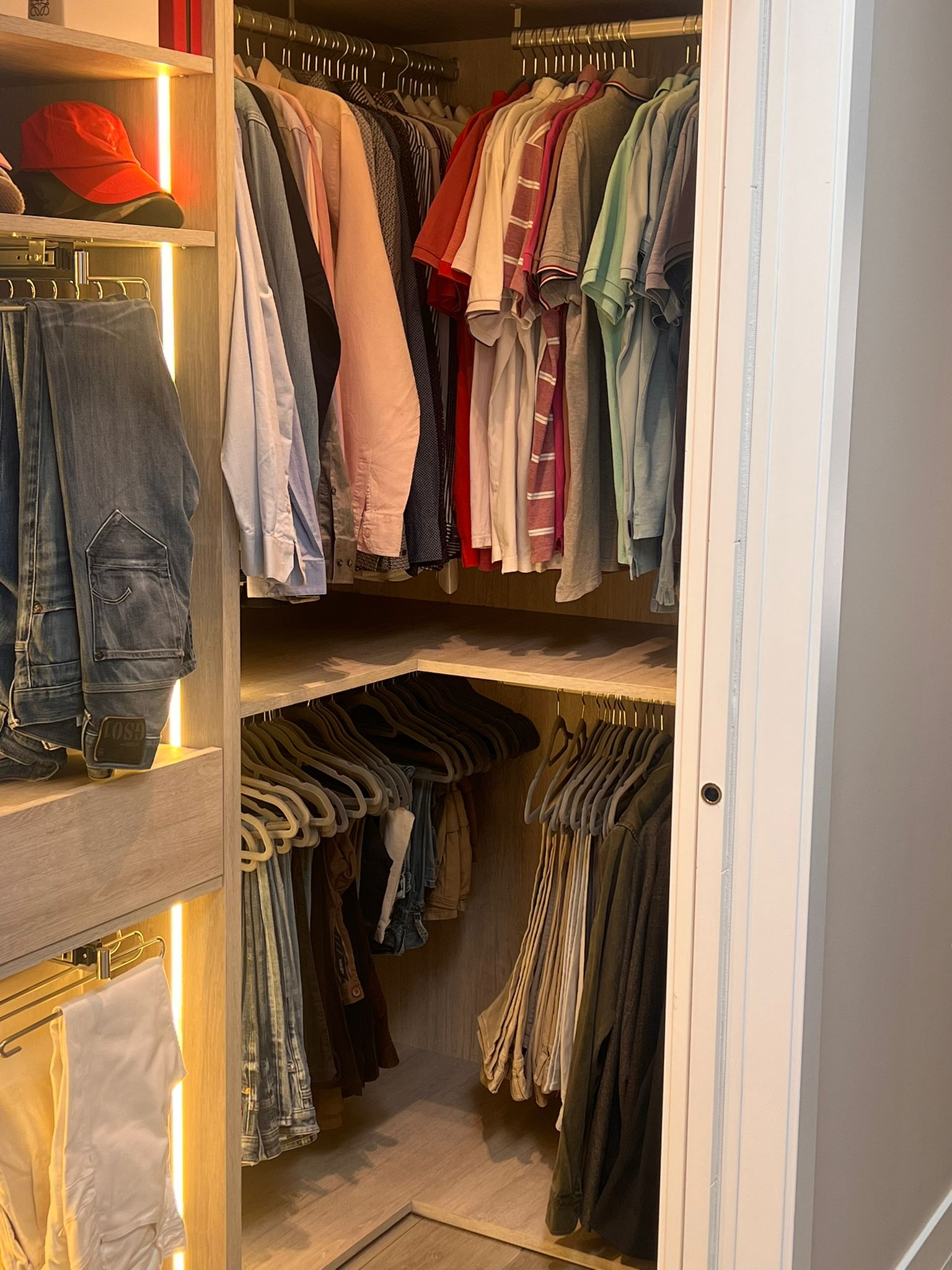 Ramón llegó a su nuevo hogar, colocó la ropa en el vestidor, pero aún tenía varias cajas por medio. Le ayudé a deshacerse de las cajas y organizar mejor su ropa.